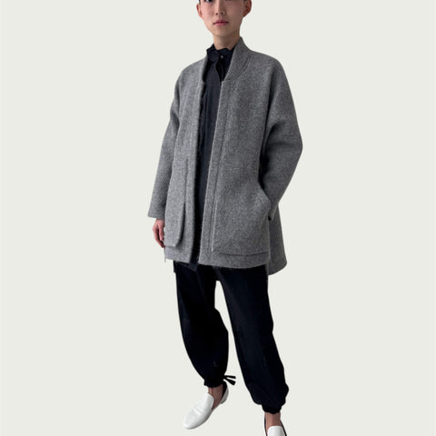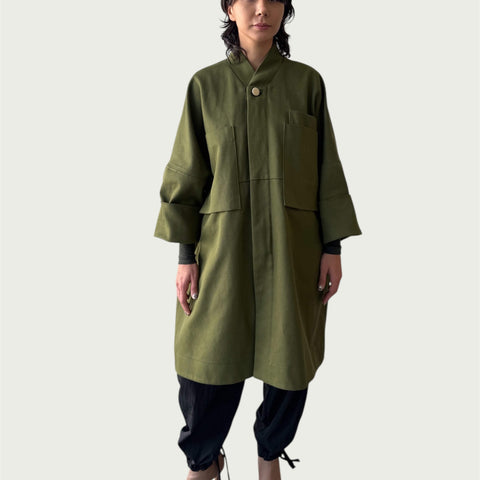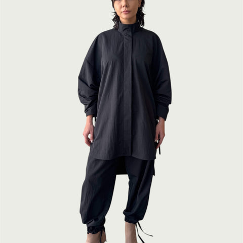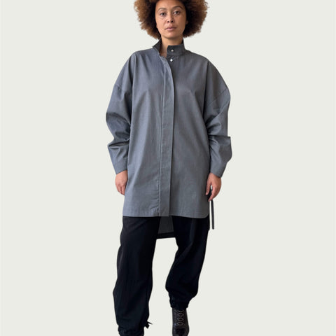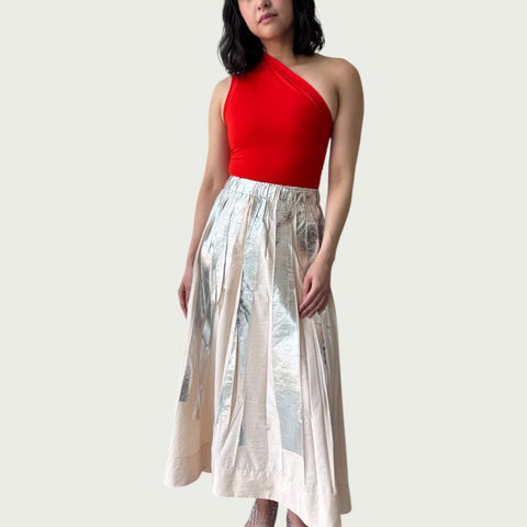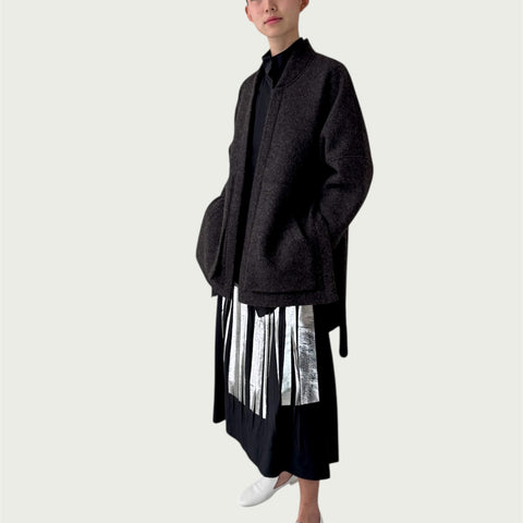 Each piece in the Foil Form Series begins with a fold. The garment is pleated by hand, then pressed beneath a sheet of silver foil. As it’s unfolded, the foil fractures—leaving behind a mirrored impression shaped by pressure, movement, and chance.