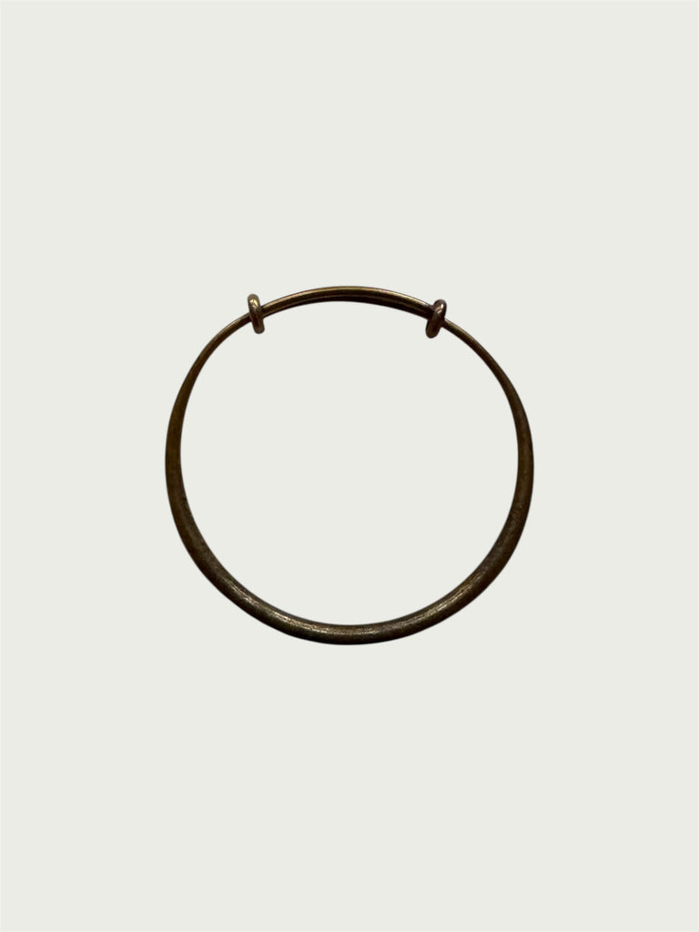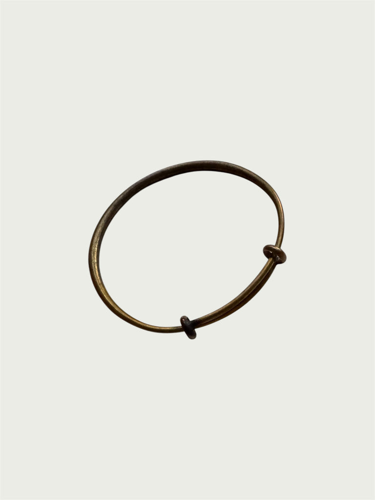 A closed brass bangle shaped with soft, delicate curves that contrast beautifully with the natural ruggedness of the metal. It slides open with light pressure and forms back to your wrist with a gentle pinch, creating an easy, comfortable fit.
