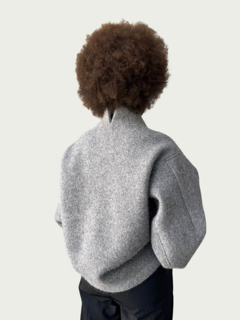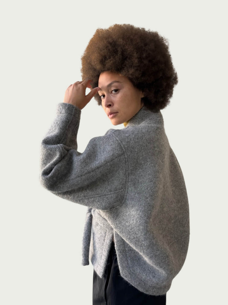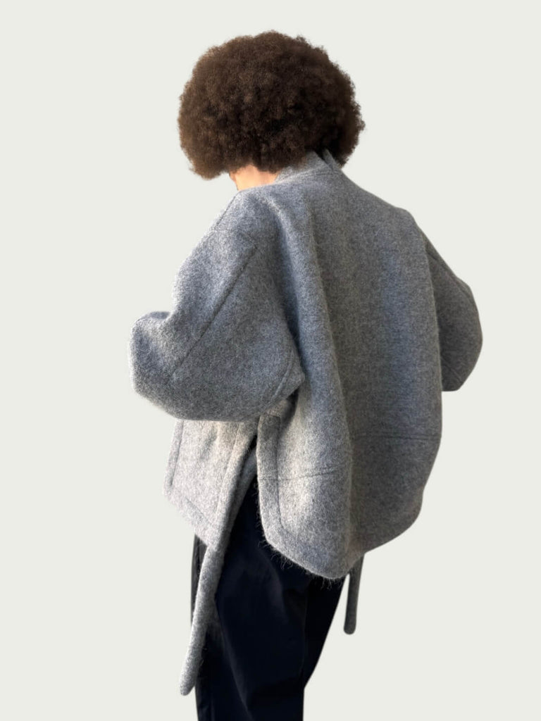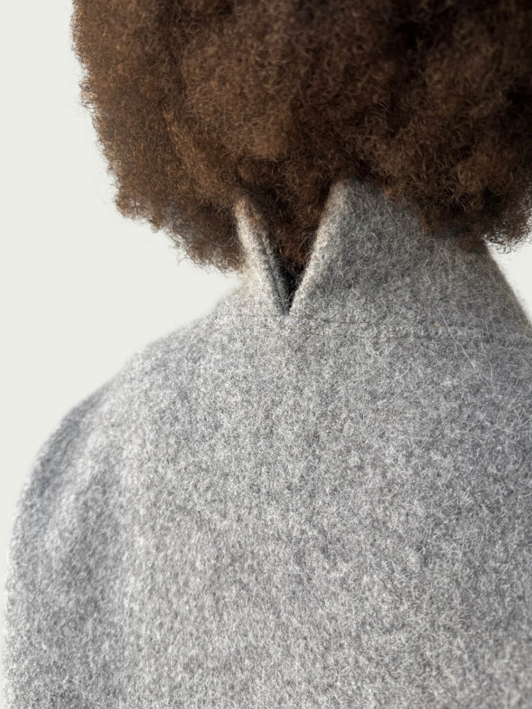 A sculptural study in proportion and form. The Vitruvian Wrap Coat is cut from undyed, naturally coloured alpaca boiled wool — a material chosen for its tactile depth, warmth, and quiet strength. Designed as a statement for every day — effortless in wear, yet commanding in shape.