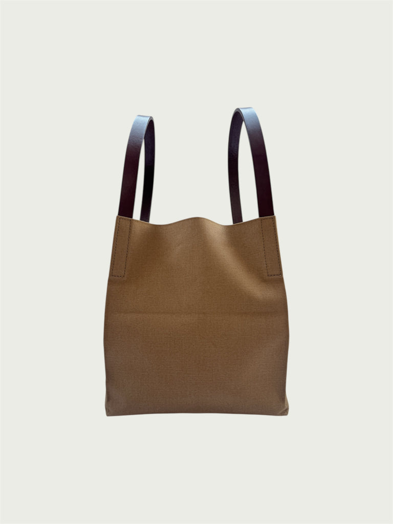 Structured canvas mini tote with bark-tanned leather handles—compact form, real capacity, everyday ready.